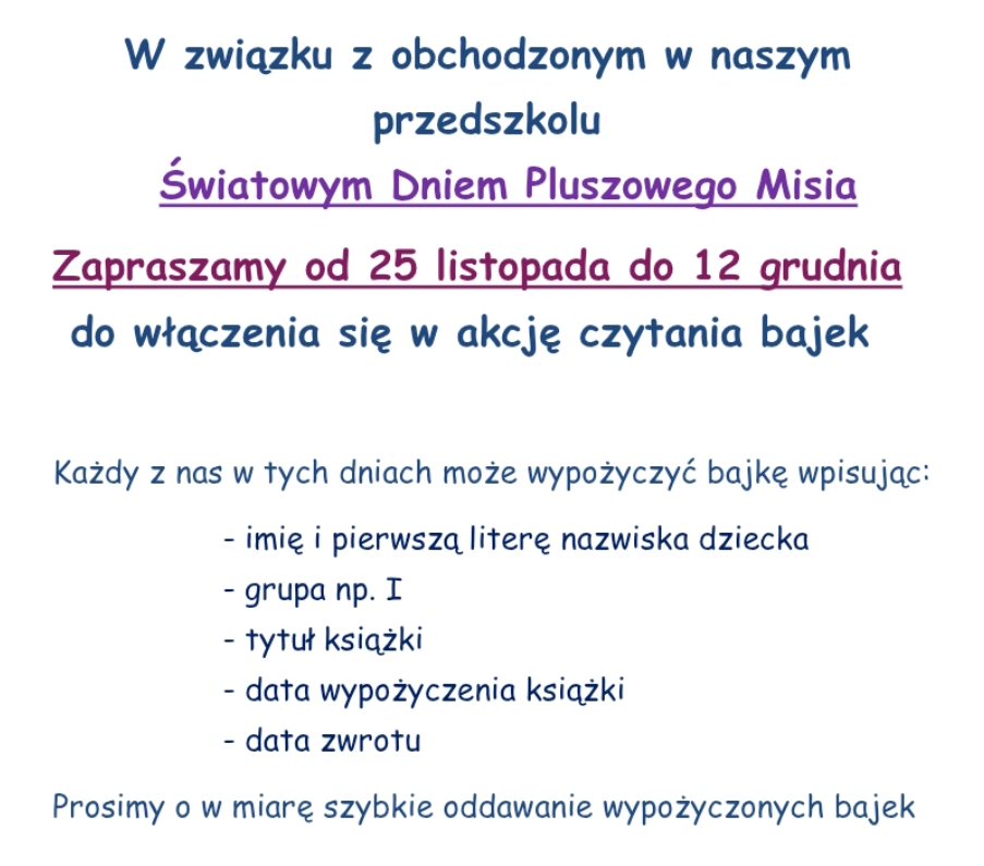 Każdy może tego dnia zabrać ze sobą zabawkę przedstawiającą ulubioną postać z wybranej bajki (maskotka, figurka, itp.). Prosimy nie przynosić niebezpiecznych akcesorii typu miecz itp.