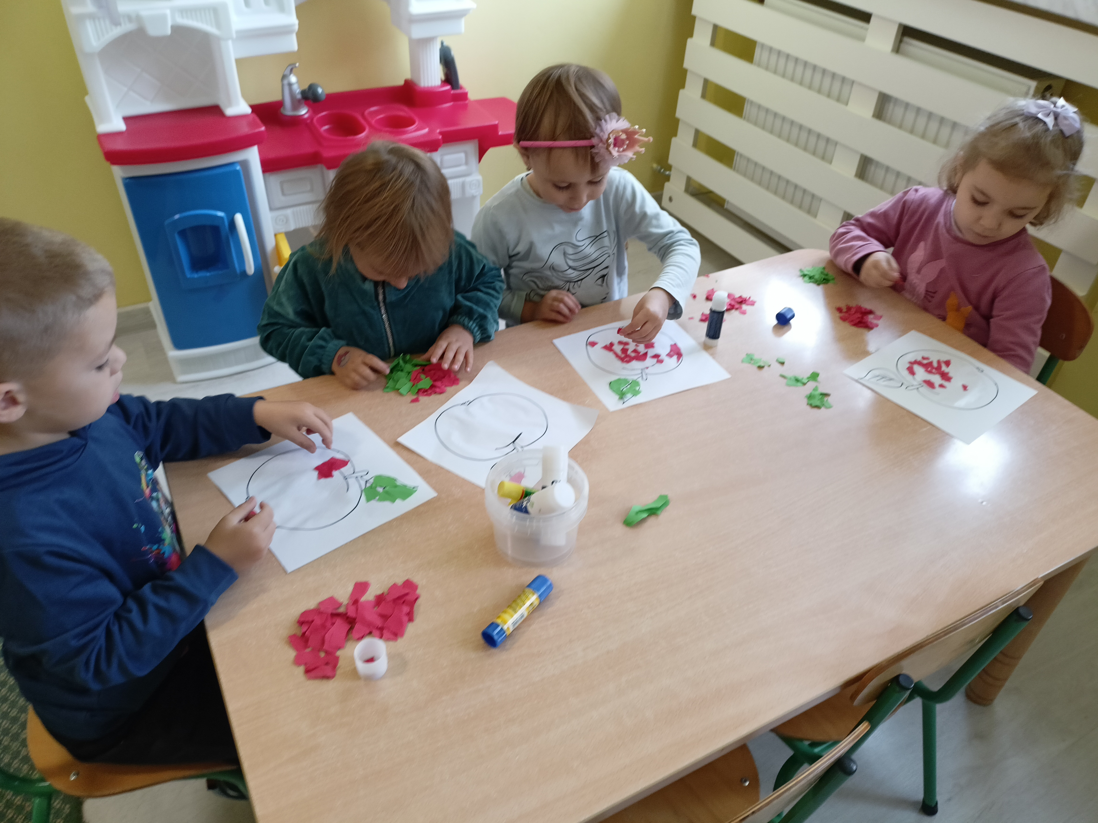 W grupie I Dzień Jabłka był okazją do rozmów na temat zdrowego odżywiania oraz wartości odżywczych, jakie kryją się w tym popularnym i lubianym przez dzieci owocu. Przedszkolaki dowiedziały się, dlaczego warto jeść jabłka, jakie witaminy zawierają oraz jak wpływają na nasze zdrowie, a także co można zrobić z jabłek – nie zabrakło pomysłów na szarlotkę, kompot, sok, mus czy dżem. Kolejnym punktem programu był teatrzyk o dzieleniu się, który dzieci obejrzały z dużym zainteresowaniem. Przedstawienie nie tylko bawiło, ale również uczyło ważnej wartości, jaką jest umiejętność dzielenia się z innymi. W ramach zabawy i aktywności ruchowych dzieci segregowały jabłka według koloru – czerwone, zielone i żółte – rozwijając przy tym spostrzegawczość i umiejętność klasyfikowania. Dużym wyzwaniem i jednocześnie świetną zabawą było pokonanie toru przeszkód z jabłkiem na łyżce, który wymagał koncentracji i zręczności. Na zakończenie odbyła się degustacja pysznego dżemu jabłkowego podanego na herbatnikach. Dzieci z apetytem próbowały smakołyku, który doskonale podsumował nasze jabłkowe święto.