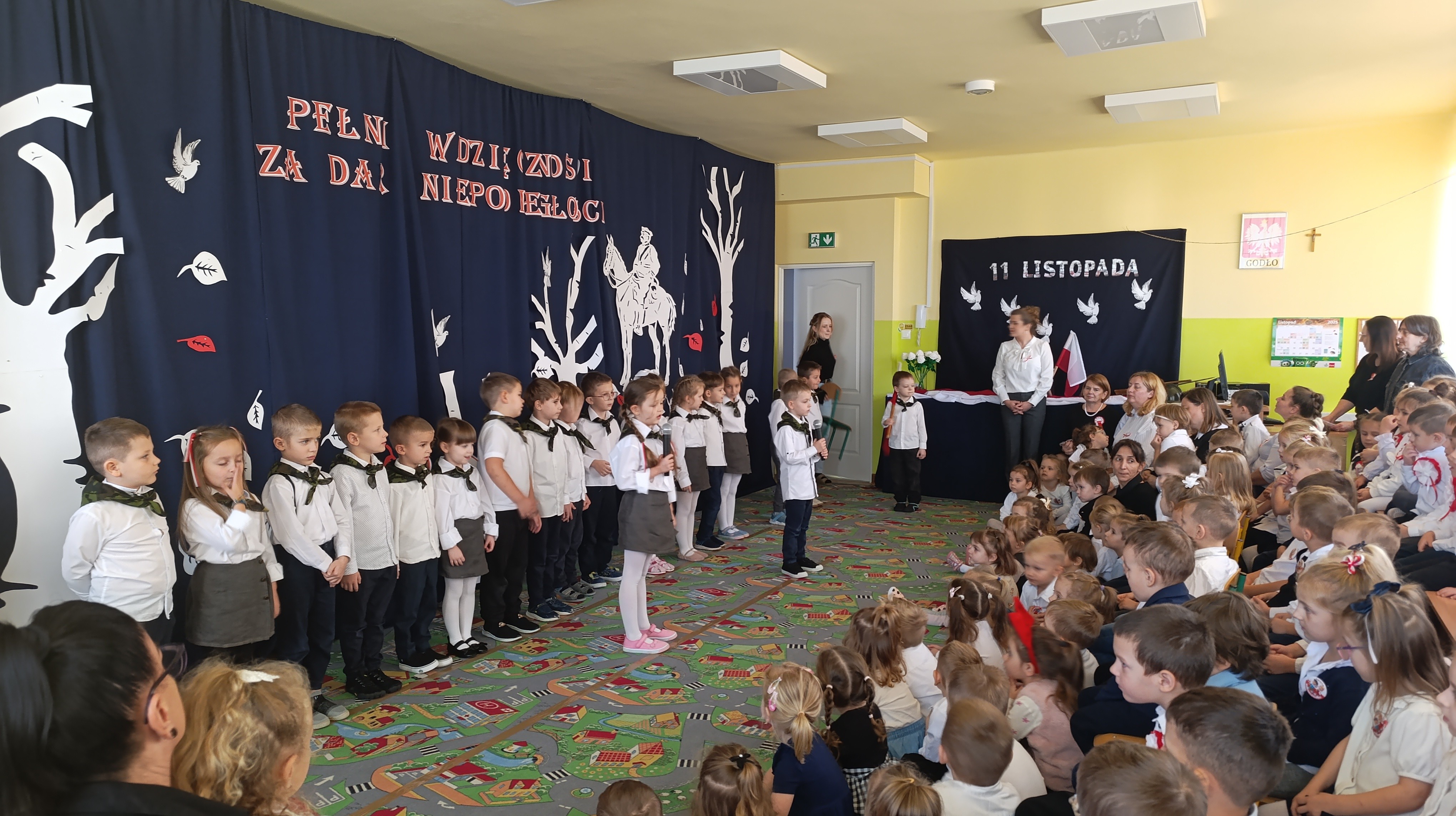 W przedszkolu od najmłodszych lat uczymy dzieci patriotyzmu, przywiązania do swojej Ojczyzny, do ziemi rodzinnej oraz szacunku do symboli narodowych. Dlatego też 6 listopada w naszym przedszkolu odbyła się uroczysta akademia z okazji Narodowego Święta Niepodległości. Przedszkolaki z VI grupy od paru tygodni przygotowywały się do tego ważnego wydarzenia pod opieką wychowawców. Uroczystość rozpoczęła się od powitania wszystkich przedszkolaków przez Panią Dyrektor, która przypomniała dzieciom znaczenie tego ważnego dnia w historii Polski. Podczas występu dzieci recytowały wiersze patriotyczne, śpiewały piosenki.
