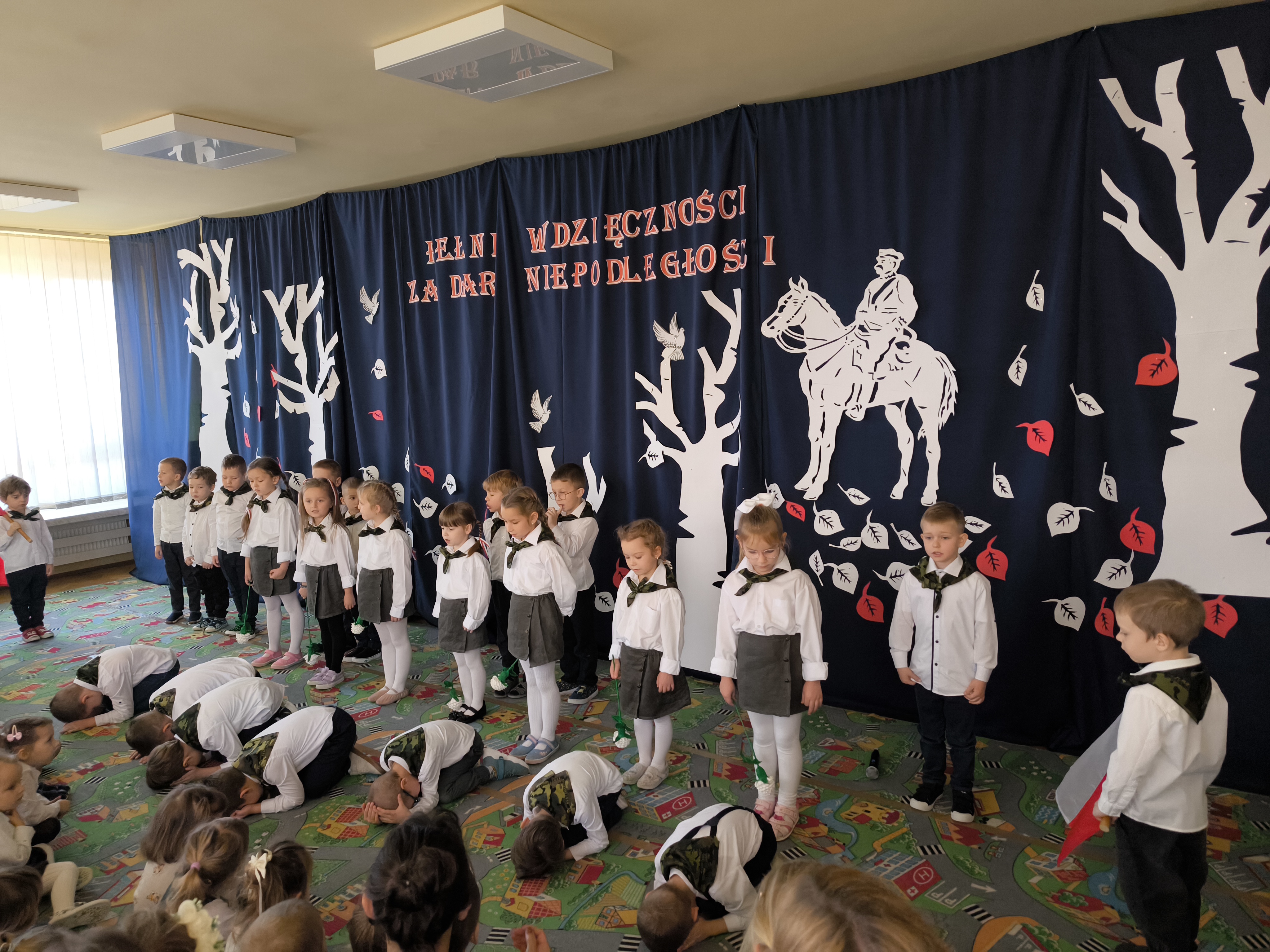 Występy były pełne emocji, radości i dumy z bycia Polakiem. Uroczystość przebiegła w miłej, podniosłej atmosferze i była wspaniałą lekcją patriotyzmu dla wszystkich przedszkolaków. Dzień Niepodległości był bardzo radosnym dniem w naszym przedszkolu i mamy nadzieję, że zapadnie on w pamięci naszych „Małych Polaków ".