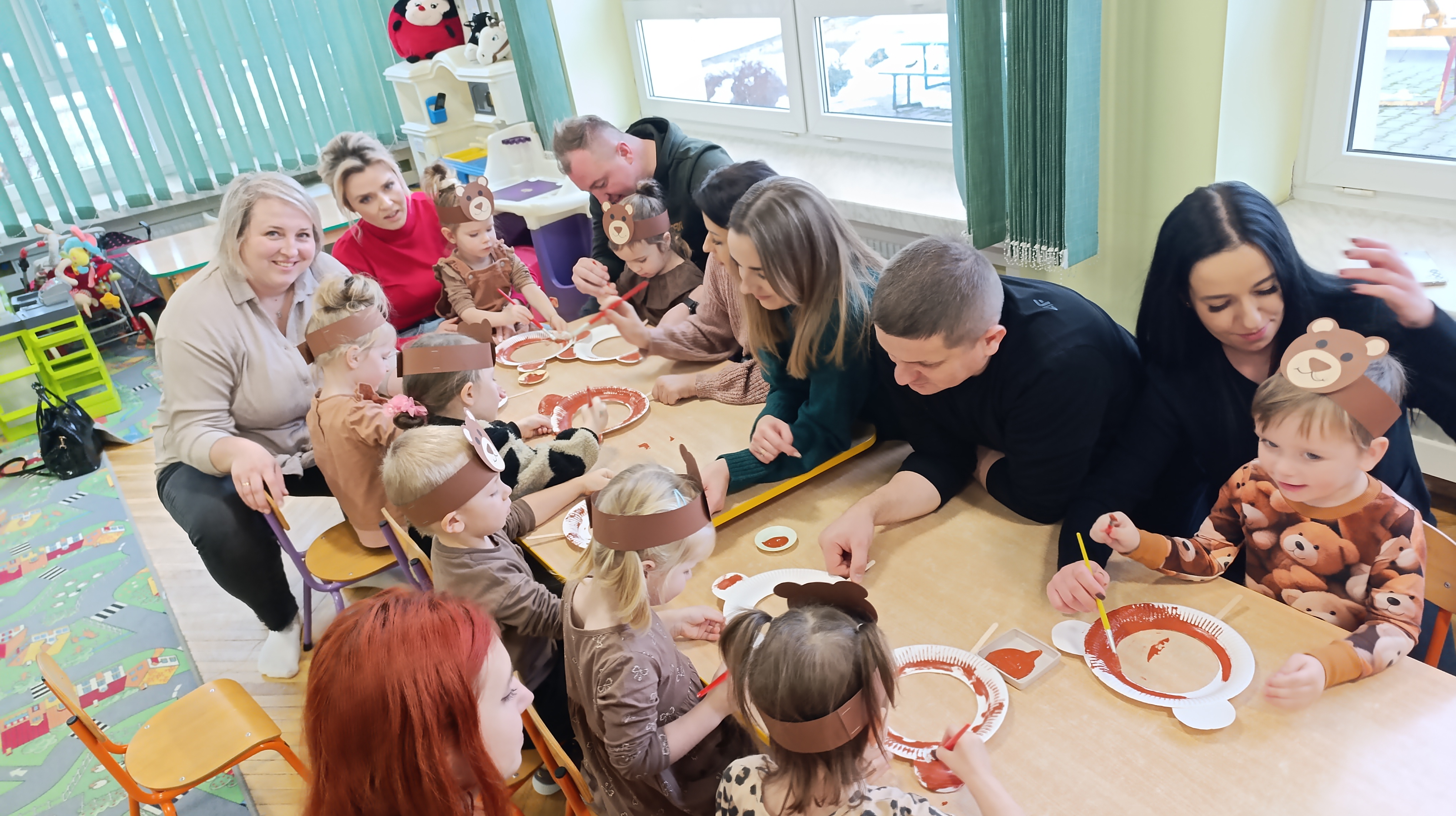 W części plastycznej dzieci wspólnie z rodzicami stworzyły piękne, pomysłowe misiowe fotobudki z talerzyków papierowych, które zostały pomalowane brązowa farbą. Każdy przedszkolak mógł później zrobić sobie pamiątkowe zdjęcie z własnym „misiem”.