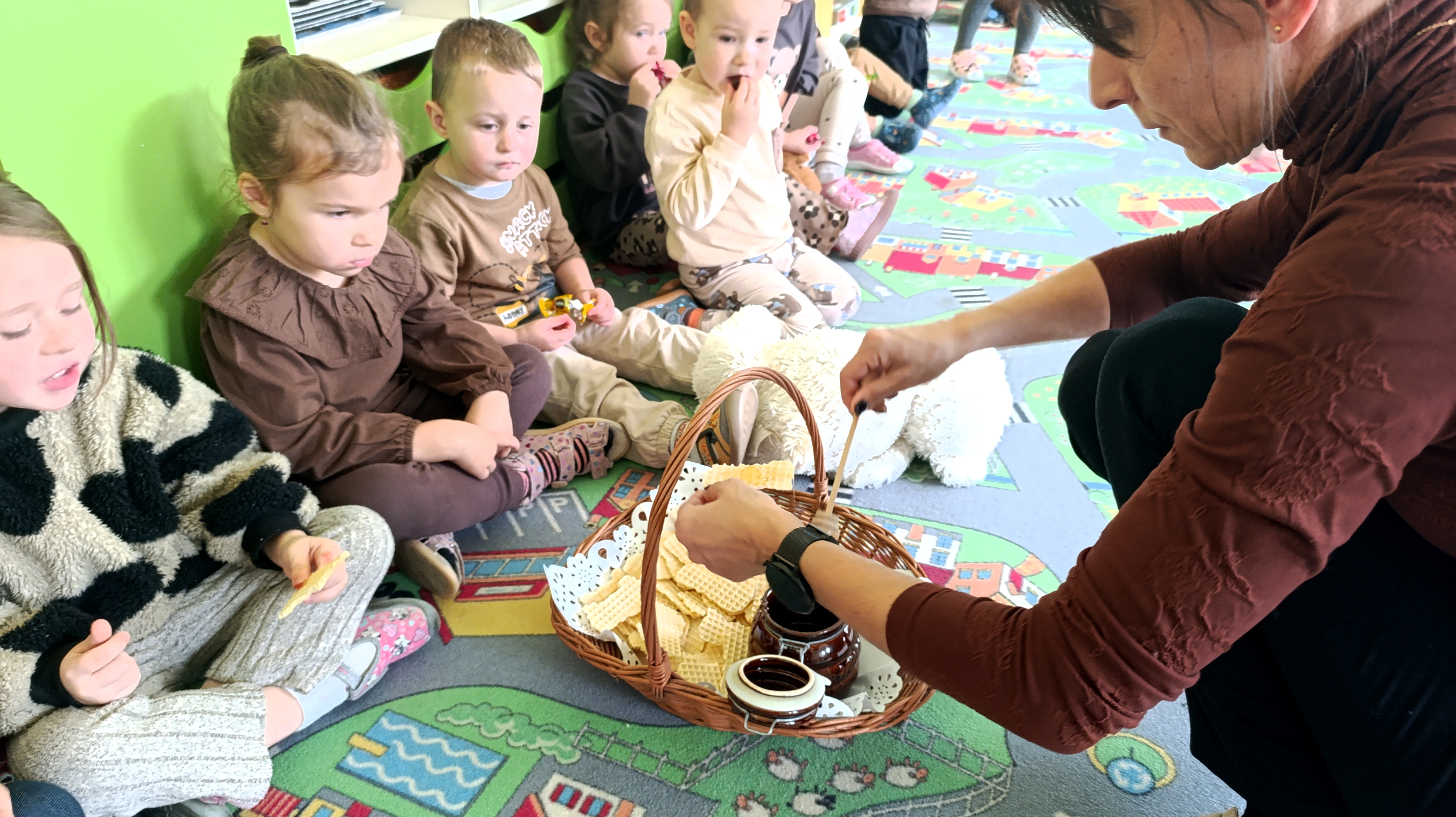 Na zakończenie zajęć dzieci otrzymały naklejki „Przyjaciel misiów” oraz misiowe andrutki z misiowym przysmakiem - miodem.