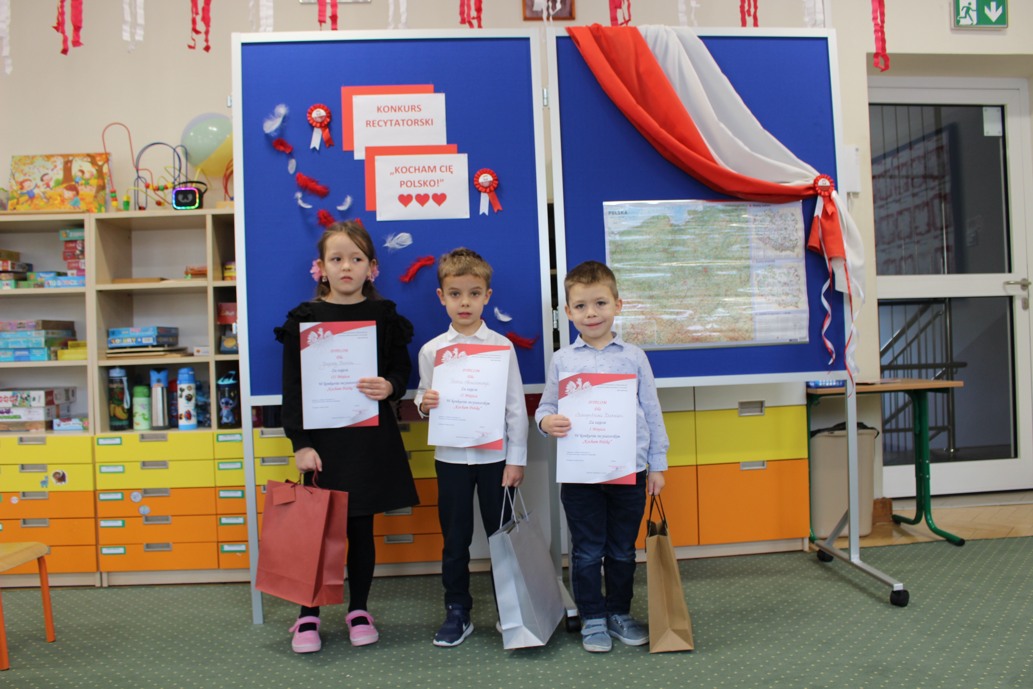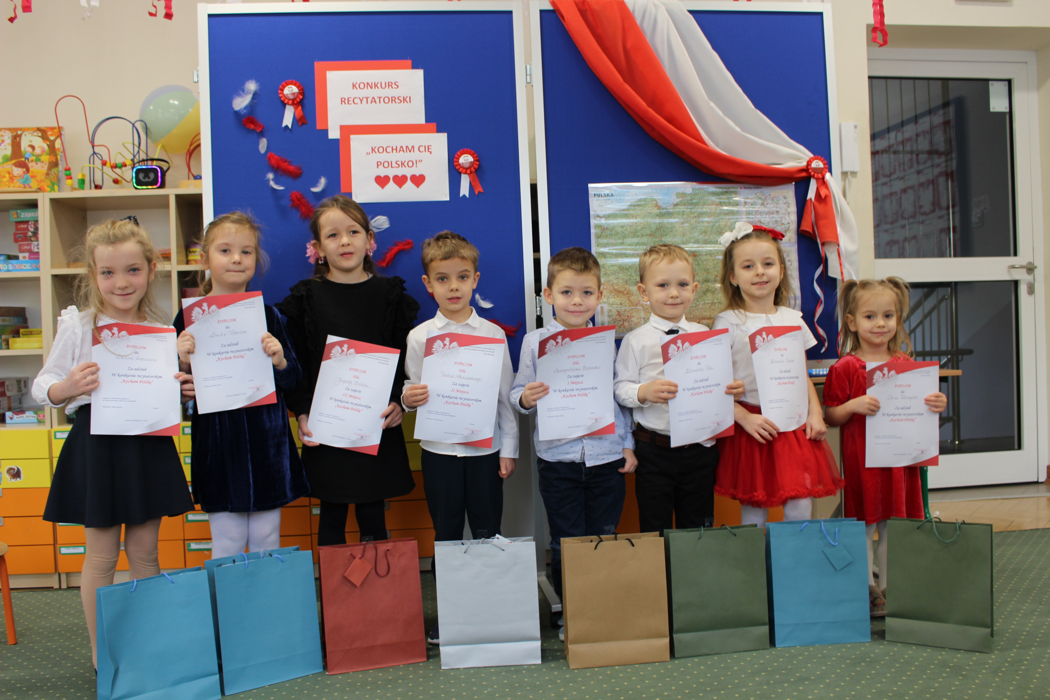 W konkursie uczestniczyli : Oliwia Rempel z gr.II , Maksymilian Bochnak z gr.III , Kornelia Cender ,Kornel Pieja z gr.IV , Wiktoria Wozowicz , Emilia Tobiasz, Piotr Henowski z gr.V , Jagoda Baran z gr.VI. Wszystkie dzieci stanęły na wysokości zadania i z wielkim wyczuciem powagi tematu deklamowały przepięknie wybrane wiersze … A za występy otrzymały dyplomy i nagrody.
