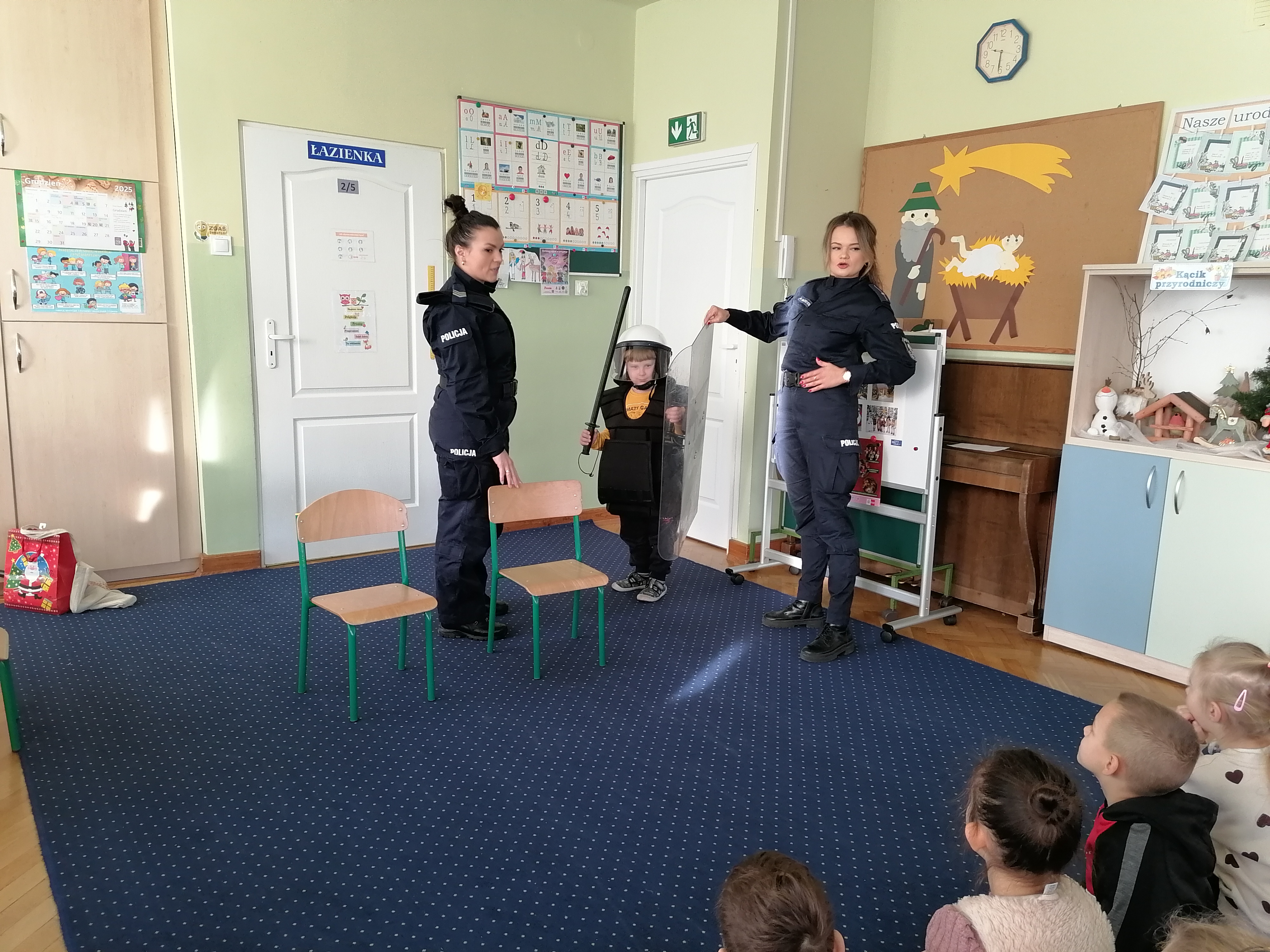 Były to policjantki pani Mariola Jarosz z Komendy Policji w Dębicy - mama naszego wychowanka oraz pani Agnieszka Olszowy - Szydło Rzecznik Prasowy z Komendy Powiatowej w Ropczycach. Panie rozmawiały z dziećmi o bezpieczeństwie w różnych sytuacjach życiowych, pokazywały różne akcesoria potrzebne w pracy policjanta. Dzieci przymierzały kamizelki ochronne, kajdanki.