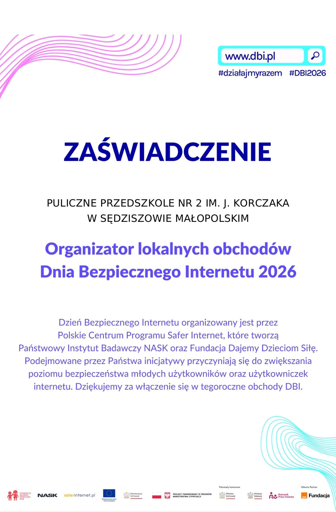 Za włączenie się w obchody DBI 2026 nasze przedszkole otrzymało Zaświadczenie