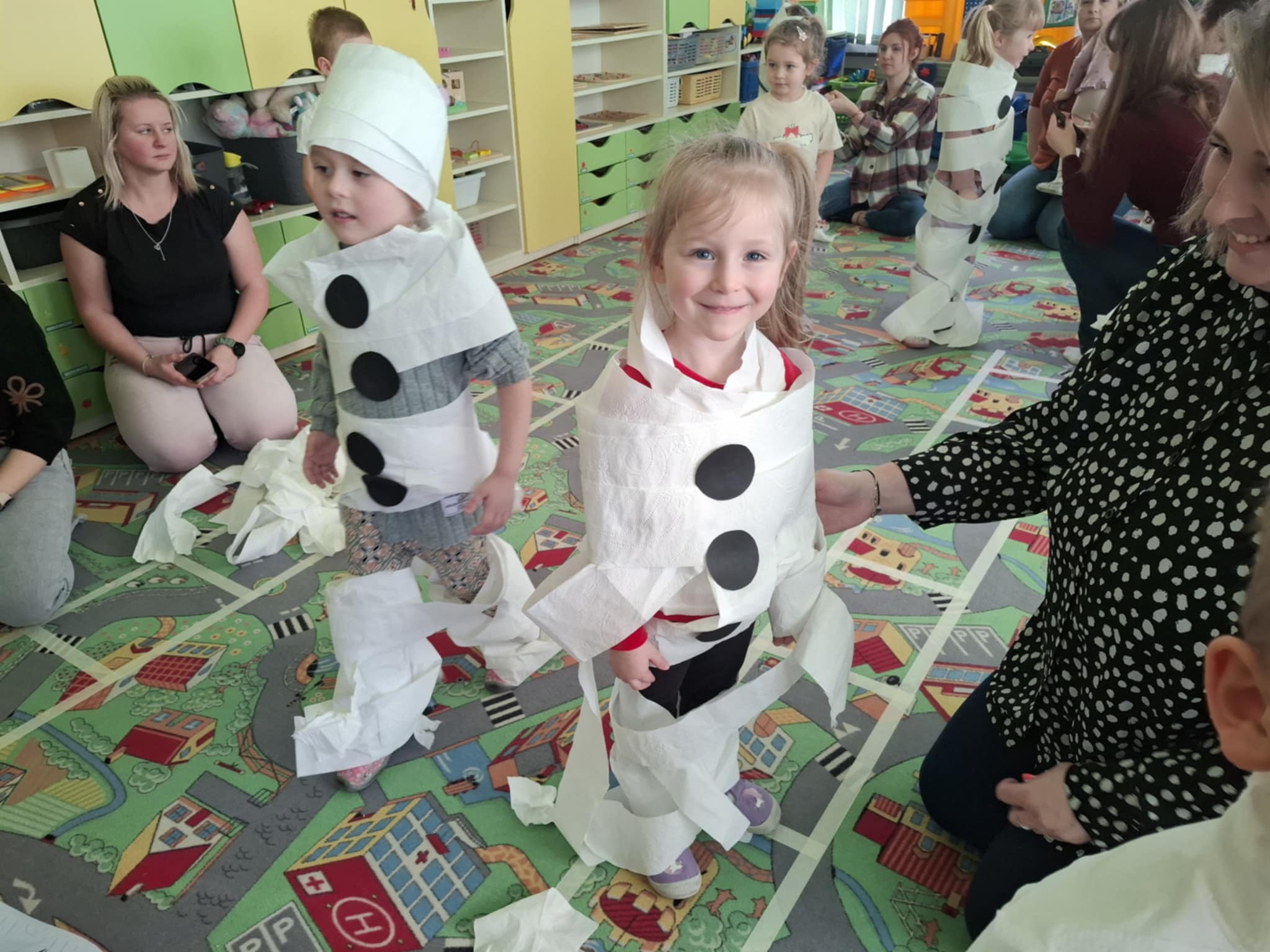 Na zakończenie odbyła się integracyjna zabawa „Rodzinne bałwanki”, podczas której rodzice zamieniali swoje pociechy w zabawne śniegowe postacie przy użyciu papieru. Śmiechu i radości nie brakowało!
