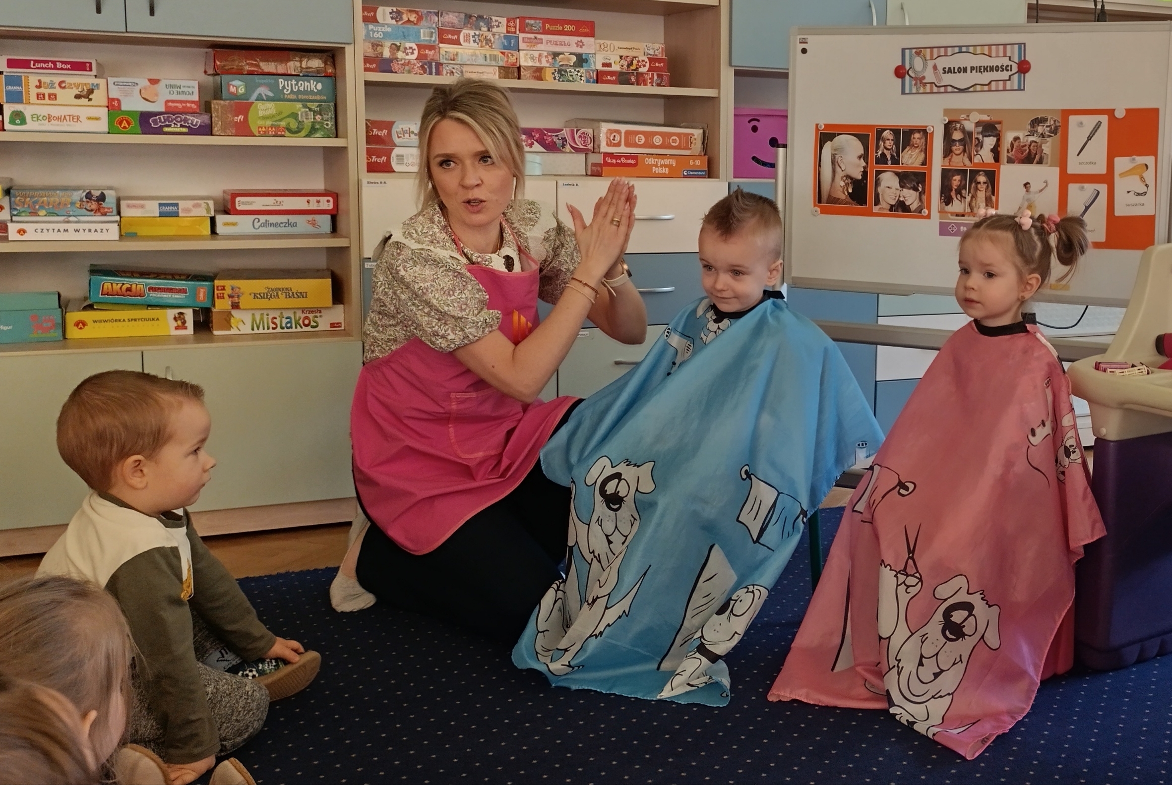 Przedszkolaki mogły przekonać się, na czym polega praca fryzjera, ponieważ sala przedszkolna zamieniła się w tym dniu w mobilny salon fryzjerski.