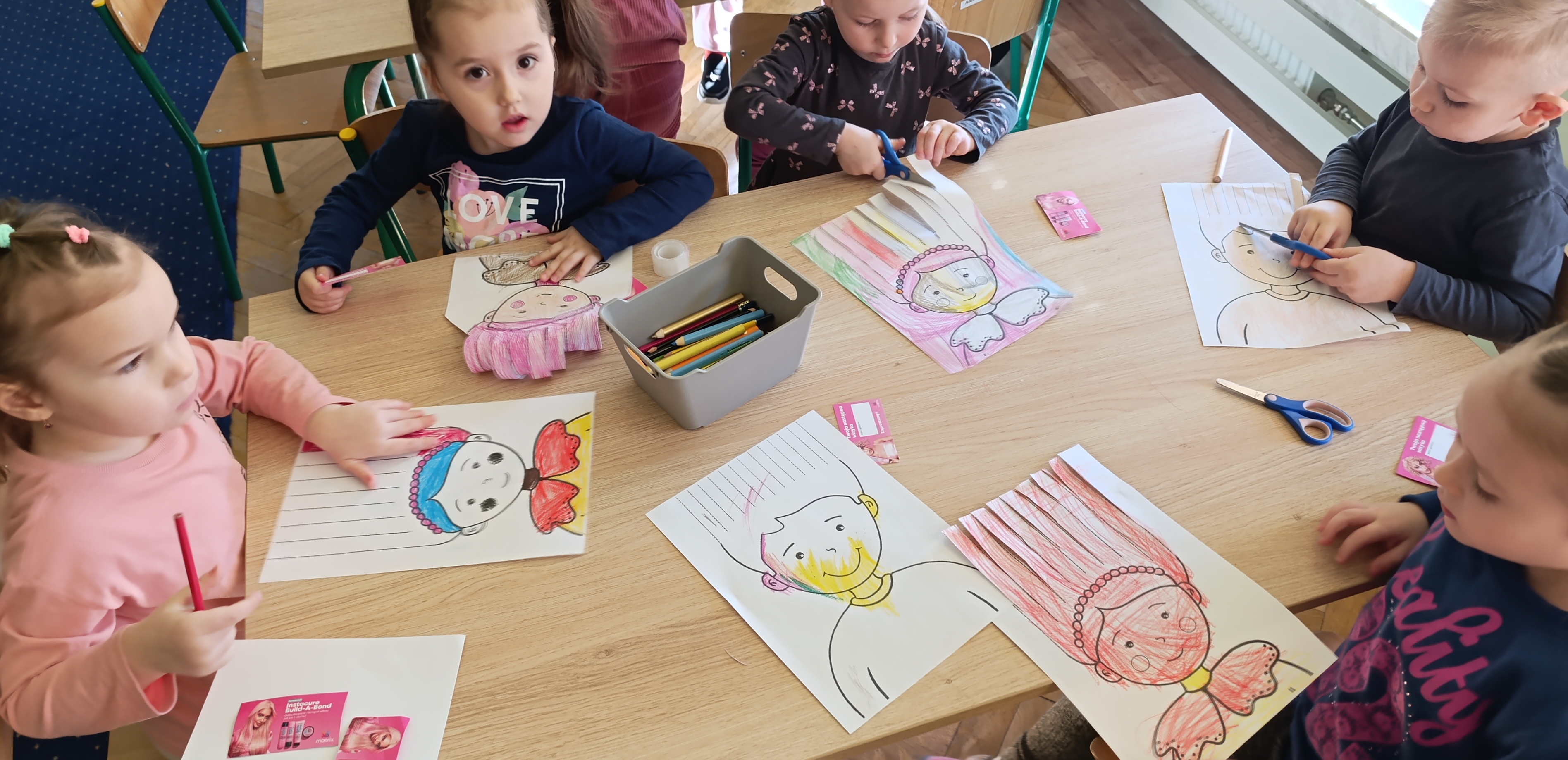 Po spotkaniu przedszkolaki wykonały pracę plastyczną kolorując kredkami i wycinając fryzury nożyczkami po śladzie.
