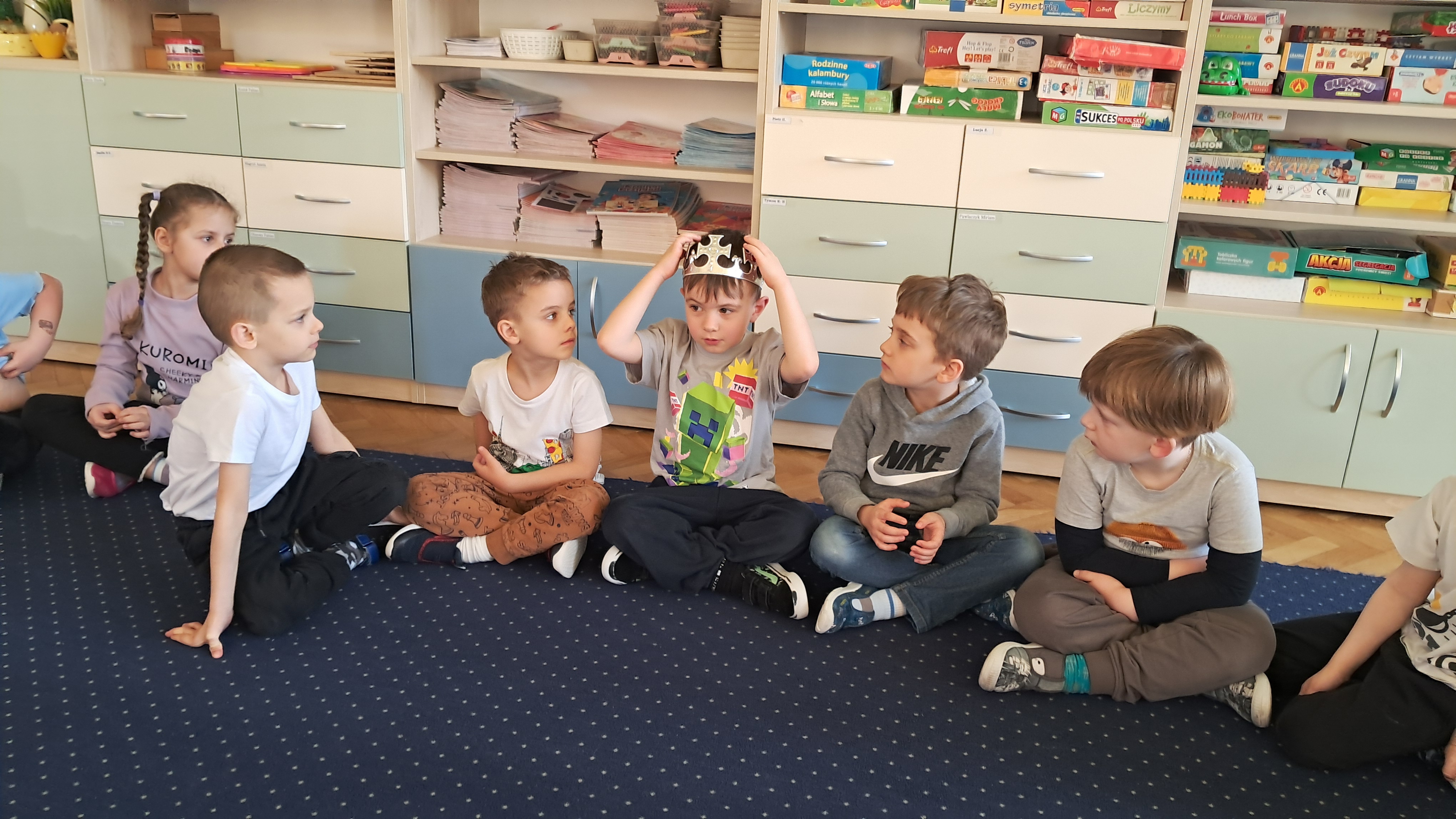 Dzieci uczestniczyły w zabawie integracyjnej „Korona”, która polegała na przekazywaniu sobie korony i wypowiadaniu zdań typu: „Jestem dumna/zadowolony z…”- co pomagało w uświadamianiu własnych sukcesów i pozytywnych emocji oraz zabawie ruchowo-naśladowczej „Pokaż swój talent” .