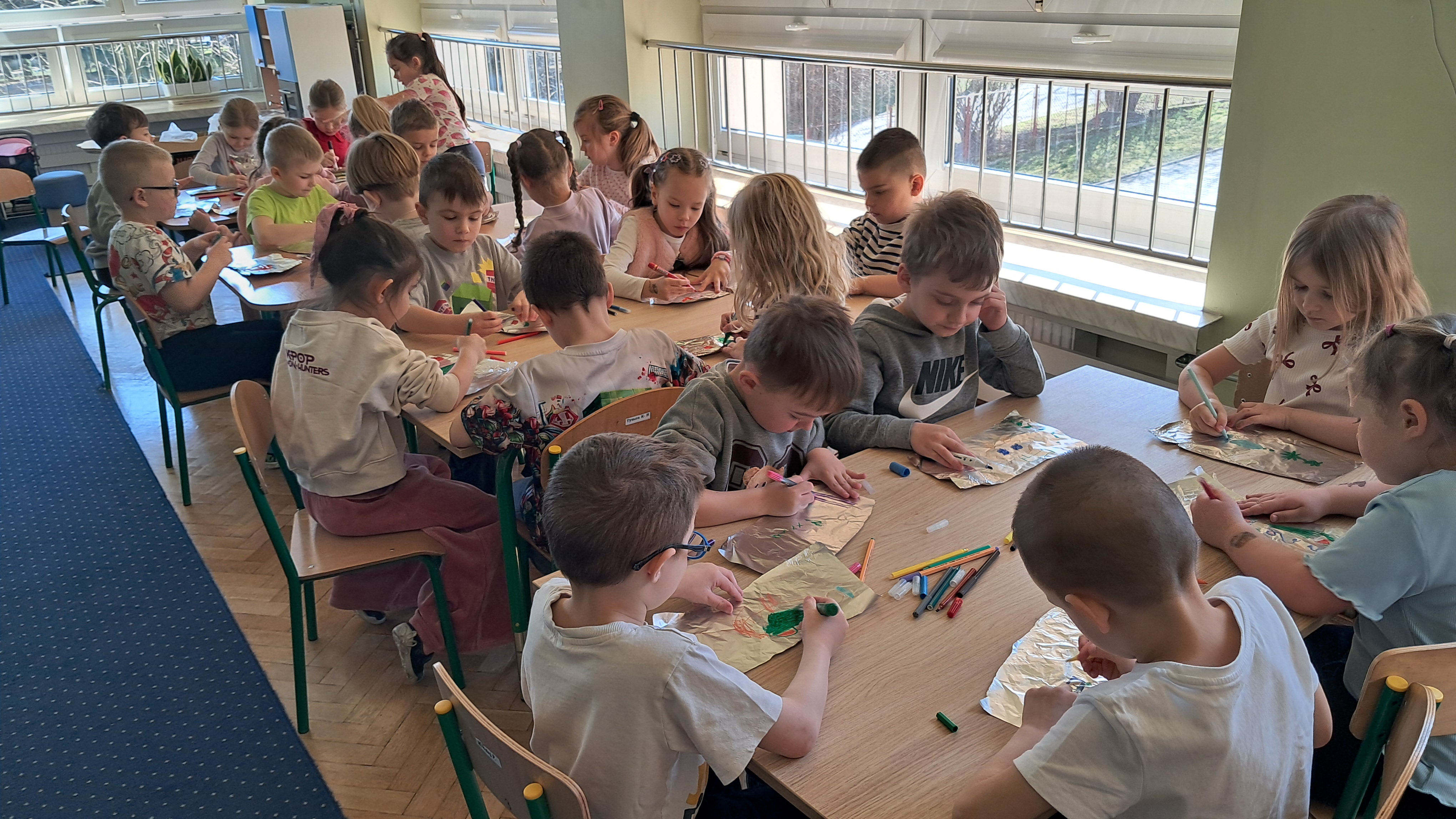 W ramach pracy plastycznej wykonaliśmy grupową pracę „Dumny jak paw” – malując piórka pawia na barwne kolory przy pomocy flamastrów, folii aluminiowej i spryskiwacza z wodą.