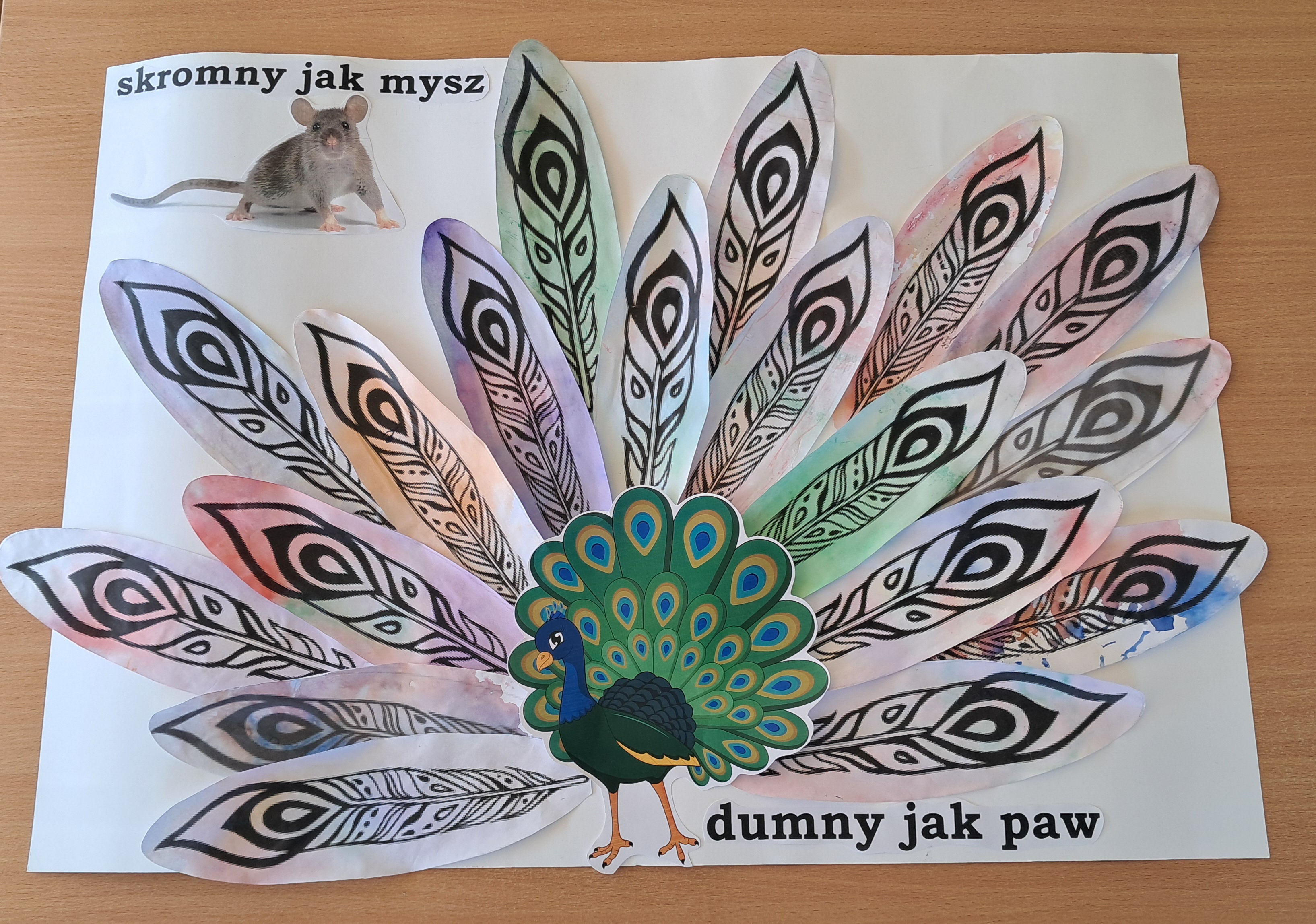 Przedszkolaki poznały także znaczenie określenia ,,dumny jak paw"- to powiedzenie opisuje osobę, która jest bardzo pewna siebie i lubi się chwalić swoimi osiągnięciami lub wyglądem. To trochę tak , jak paw, który rozkłada swój piękny ogon i chwali się tym, jak wygląda. Paw chce, żeby wszyscy go podziwiali i nie przejmuje się innymi. Zosia bohaterka naszego opowiadania na początku zachowywała się trochę jak dumny paw, a Natalia była „skromna jak myszka”. Na szczęście Zosia zrozumiała, że wywyższanie się nie jest dobrą cechą i postanowiła zmienić swoją postawę. Dzięki temu dostrzegła talenty innych. Konkurs talentów był dla niej ważną lekcją pokory.