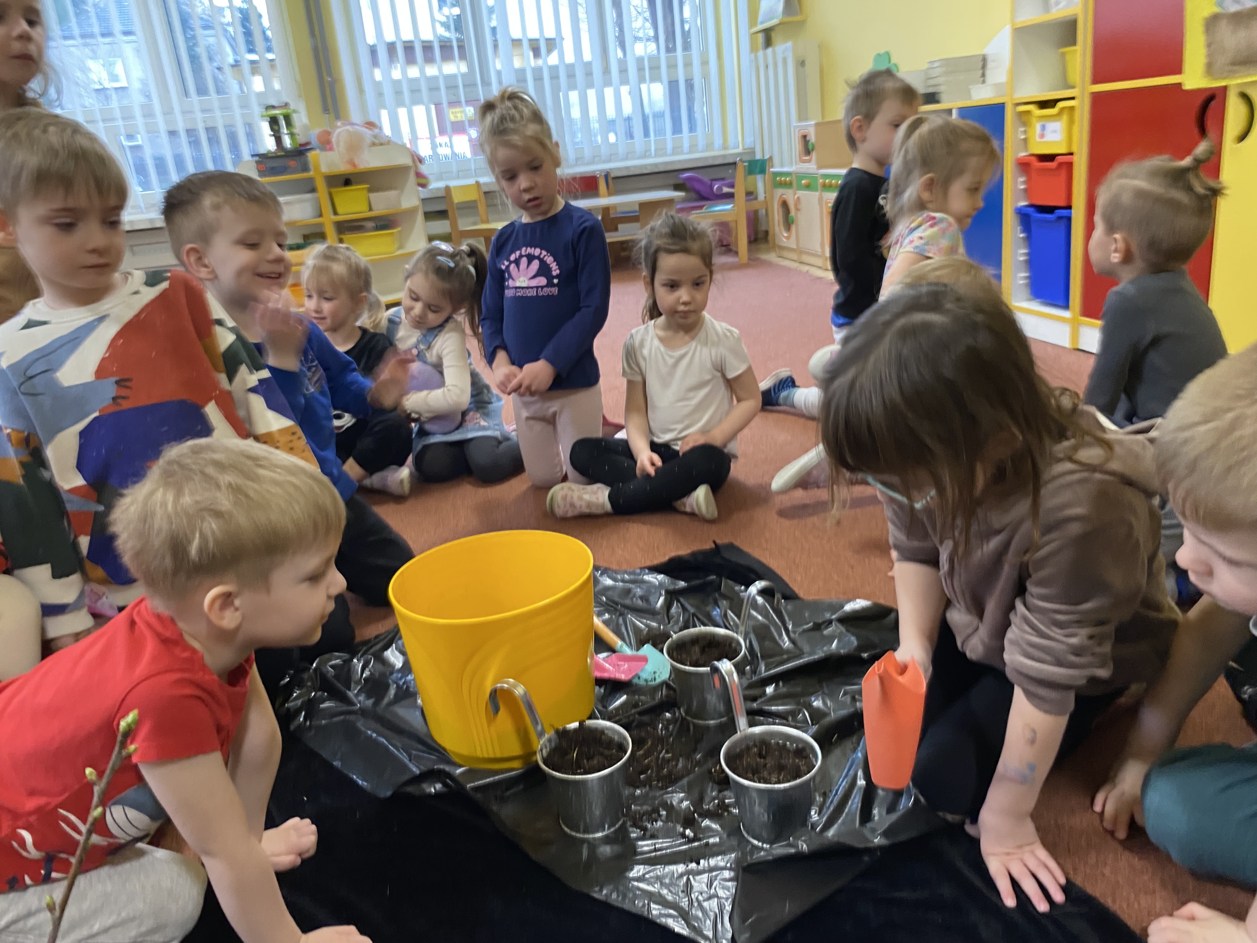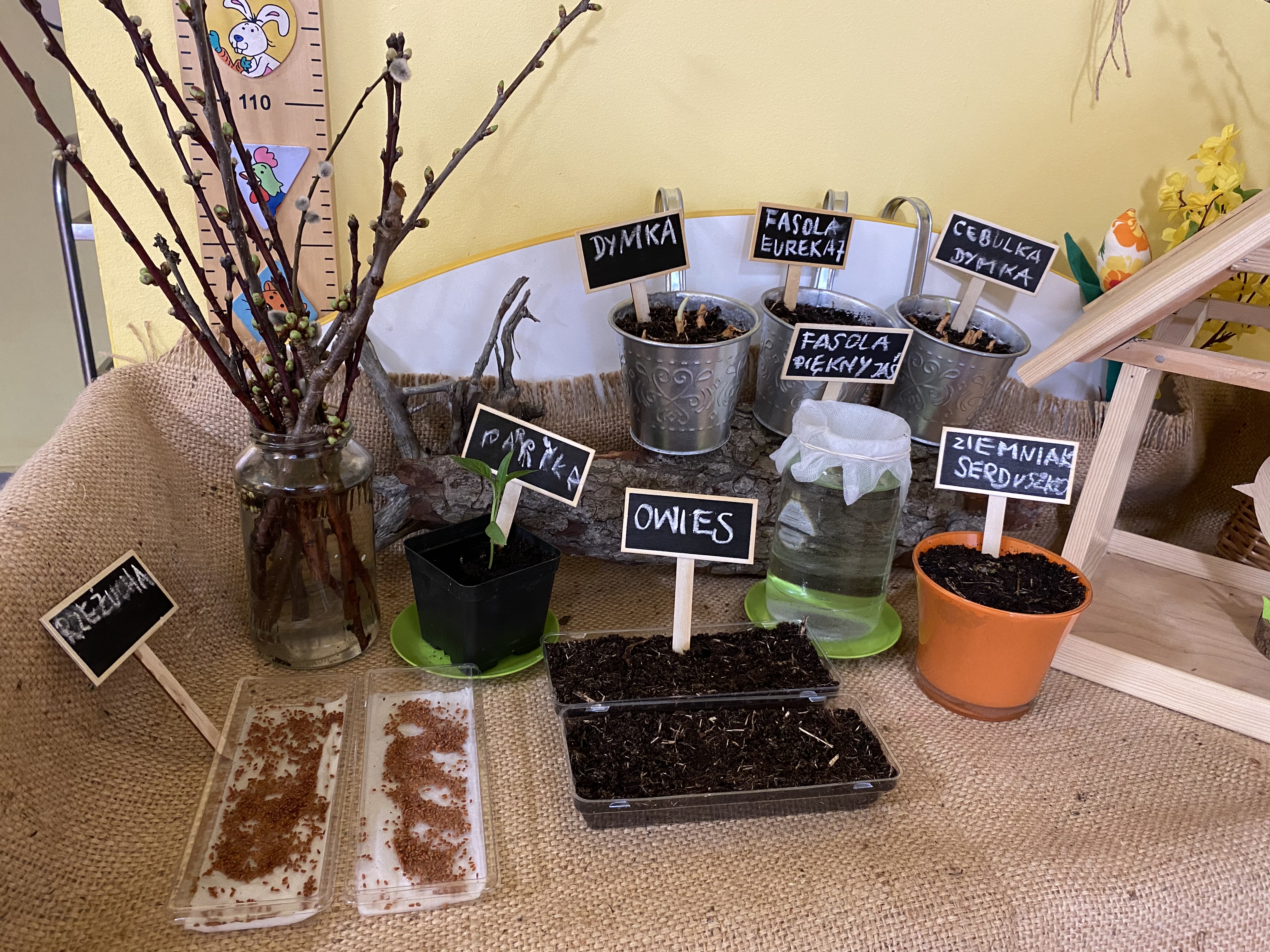 Wraz z powitaniem wiosny rozpoczęło się wiosenne przebudzenie w kącikach przyrody - dzieci pomagały i sadziły kwiaty cebulowe, cebulkę dymkę, ziemniaka, fasolę oraz siały kwiatki, owies, rzeżuchę itp. Zajęcia edukacyjne "Od nasiona do rośliny" miały na celu poszerzanie wiadomości dzieci na temat niezbędnych warunków do rozwoju roślin oraz założenie hodowli w kąciku przyrodniczym. Kącik przyrody jest dla dzieci doskonałym miejscem do prowadzenia częstych badań, eksperymentów i obserwacji. Dzięki bezpośredniej obserwacji dzieci mają możliwość, poznania cyklu rozwoju roślin. Najmłodsi uczą się także cierpliwości, sumienności, systematyczności, dokładności, czyli bycia dobrym obserwatorem przyrody.