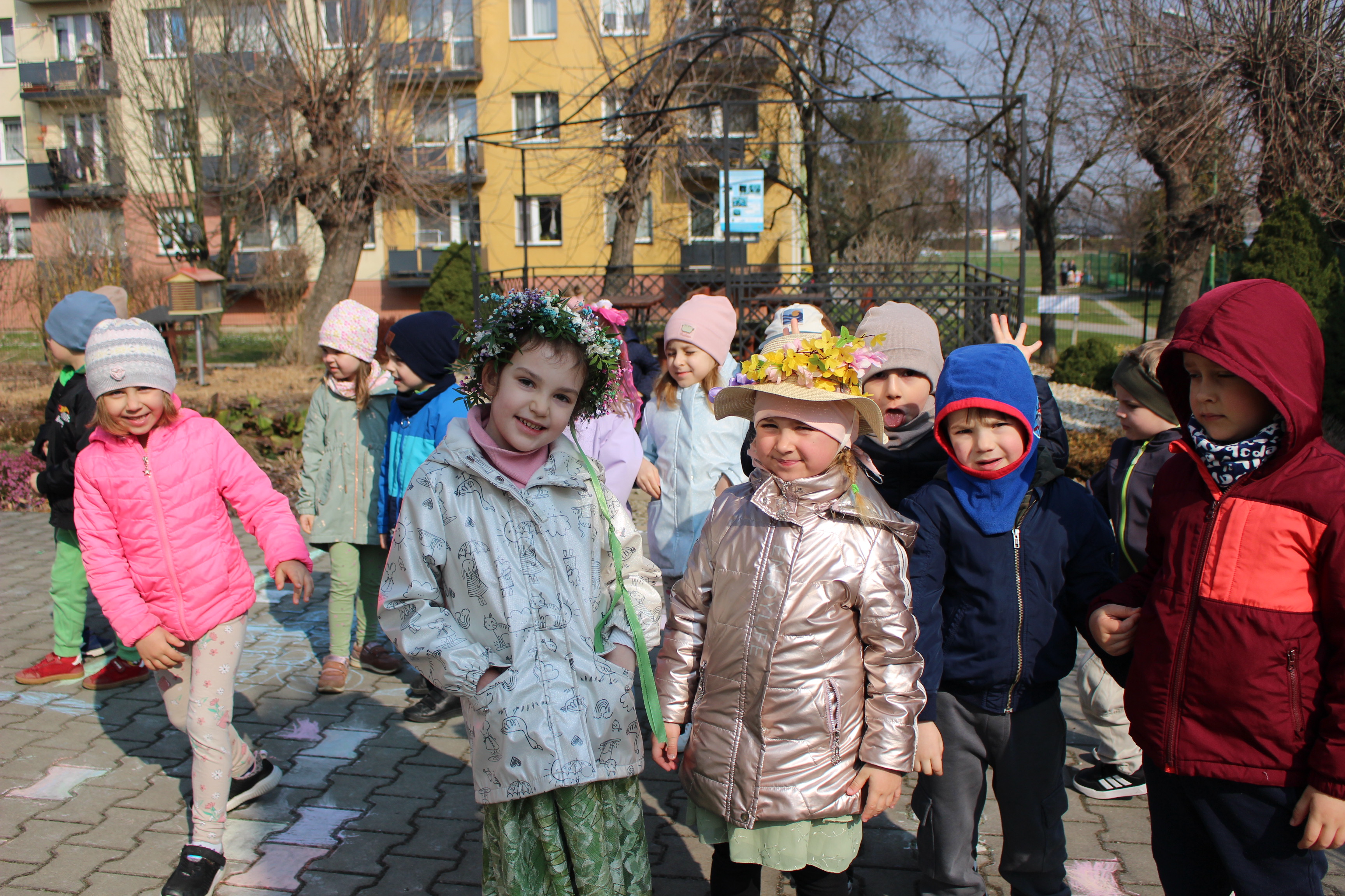 Pierwszy Dzień Wiosny w naszym Przedszkolu był pełen radości, kolorów i wspólnej zabawy. Już od samego rana można było poczuć wyjątkową atmosferę – dzieci przyszły ubrane na zielono, symbolizując budzącą się do życia przyrodę. W salach pojawiły się wiosenne dekoracje, kąciki przyrody jakoś naturalnie się zazieleniły…a uśmiechy nie schodziły z twarzy naszych przedszkolaków. Jednym z najważniejszych punktów dnia był uroczysty przemarsz. Dzieci, wyposażone we własnoręcznie wykonane ozdoby – kwiaty, gałązki i kolorowe wstążki i chorągiewki – wyruszyły na spacer po okolicy przedszkola. Wesołe piosenki i okrzyki na powitanie wiosny towarzyszyły nam przez całą drogę, przyciągając uwagę przechodniów i wywołując wiele pozytywnych reakcji – uśmiechy czy spontaniczne wymiany zdań.