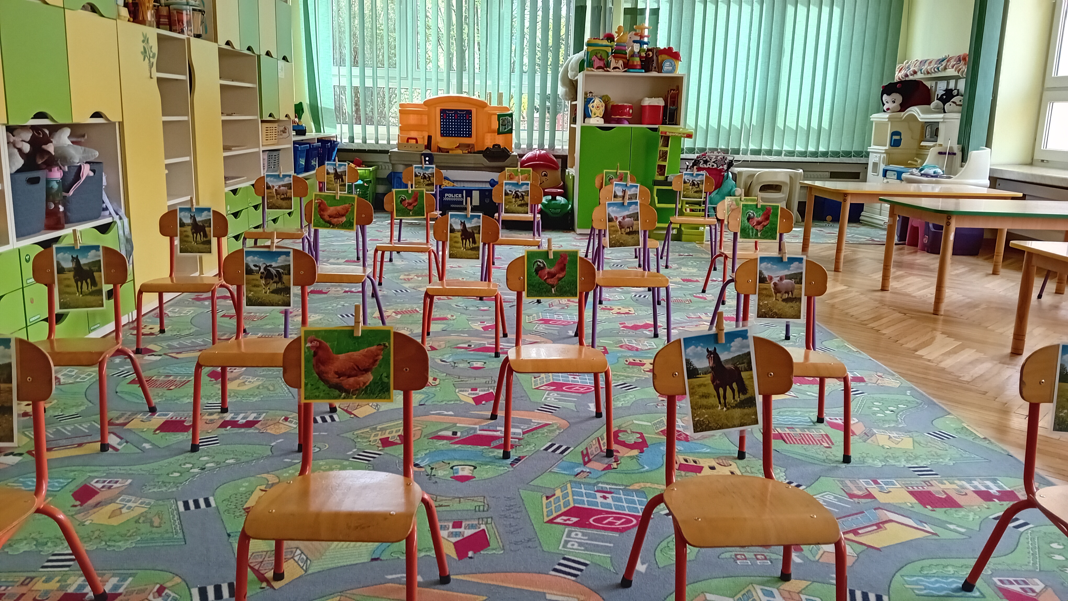 Dzieci dowiedziały się, jak wygląda codzienne życie na wsi oraz jakie obowiązki mają jej mieszkańcy. Szczególną uwagę poświęciliśmy zwierzętom gospodarskim. Przedszkolaki uczyły się rozpoznawać ich głosy oraz nazywać poszczególne zwierzęta. Doskonale poradziły sobie z odgadywaniem odgłosów krowy, świnki, konia, koguta czy kury.