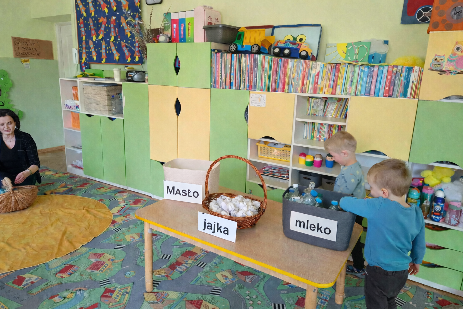 Uzupełnieniem naszych zajęć była także zabawa w sklep, która odbyła się w sali przedszkolnej. Dzieci „wybrały się” na zakupy po potrzebne produkty – mleko, masło oraz jajka – aby wspólnie przygotować pyszny placek. Przedszkolaki miały do wykonania ważne zadanie: musiały przynieść określoną ilość wybranych produktów. Świetnie poradziły sobie z liczeniem i kompletowaniem zakupów, a przy okazji uczyły się, jak wyglądają codzienne sytuacje i obowiązki.