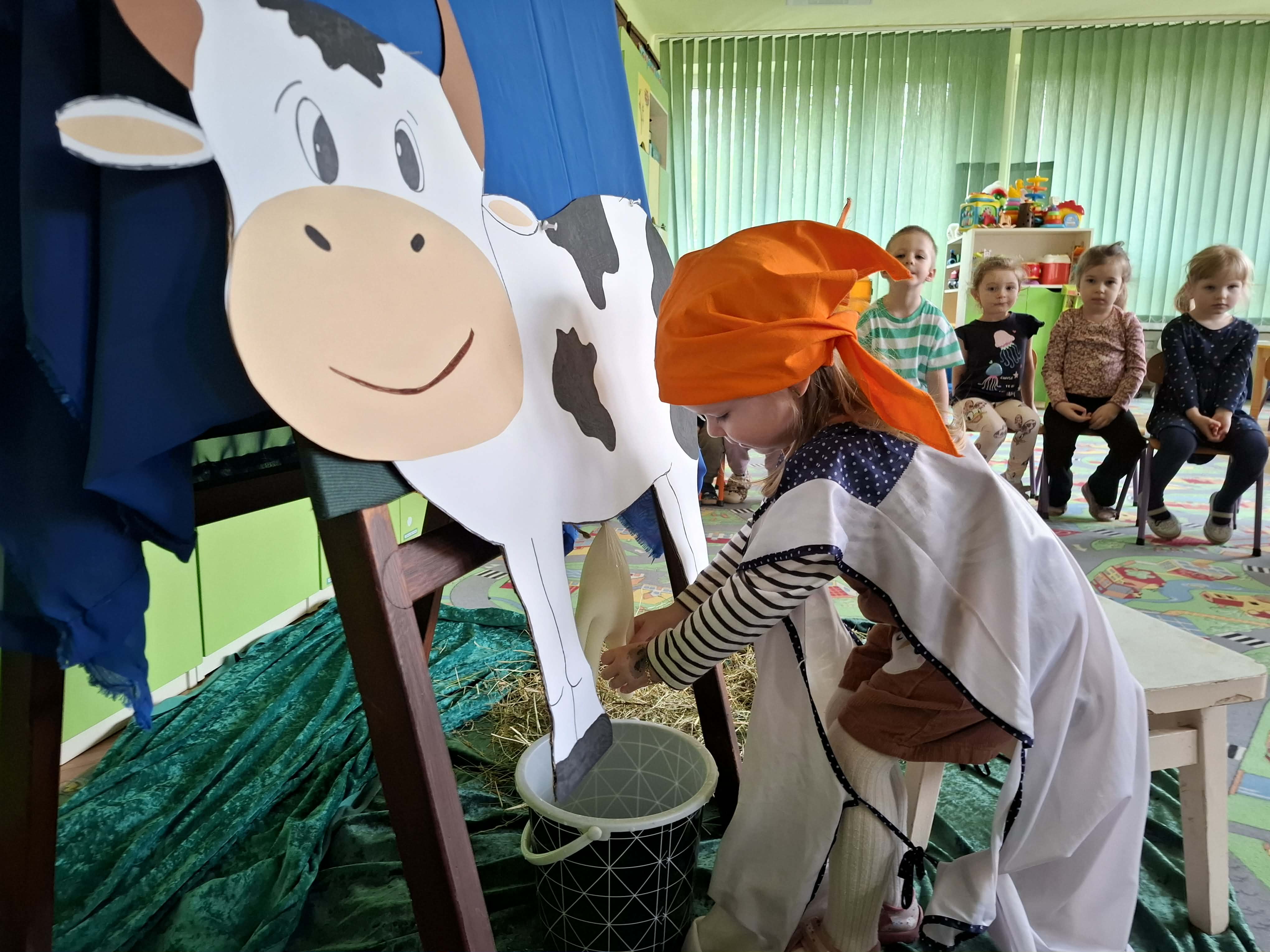 Największą atrakcją okazało się jednak „dojenie krowy”. Dzieci miały okazję spróbować swoich sił w tej czynności, co wywołało wiele radości i śmiechu. Dziewczynki wcieliły się w role gospodyń – ubrane w chusteczki na głowie i fartuszki, natomiast chłopcy wystąpili w kapeluszach, niczym prawdziwi gospodarze.
