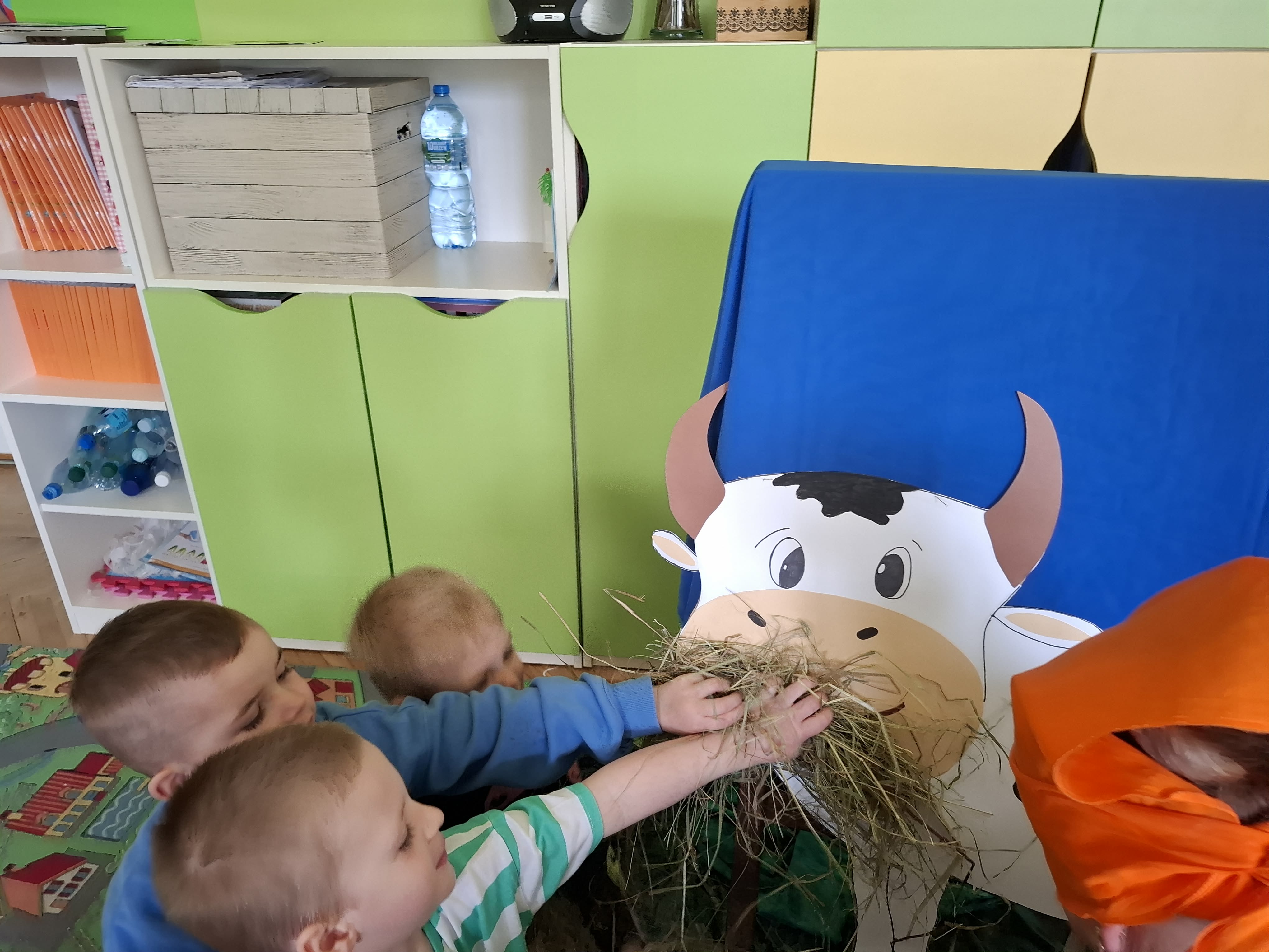 Nie zabrakło także zabaw praktycznych – dzieci karmiły „krowę” sianem, co było dla nich niezwykle ciekawym doświadczeniem i pozwoliło lepiej zrozumieć, jak wygląda opieka nad zwierzętami na wsi.