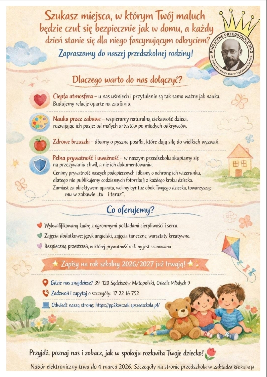 Rekrutacja do przedszkola rozpoczęła się 2 lutego 2026 r. i jest prowadzona z wykorzystaniem systemu elektronicznego Nabór PCSS