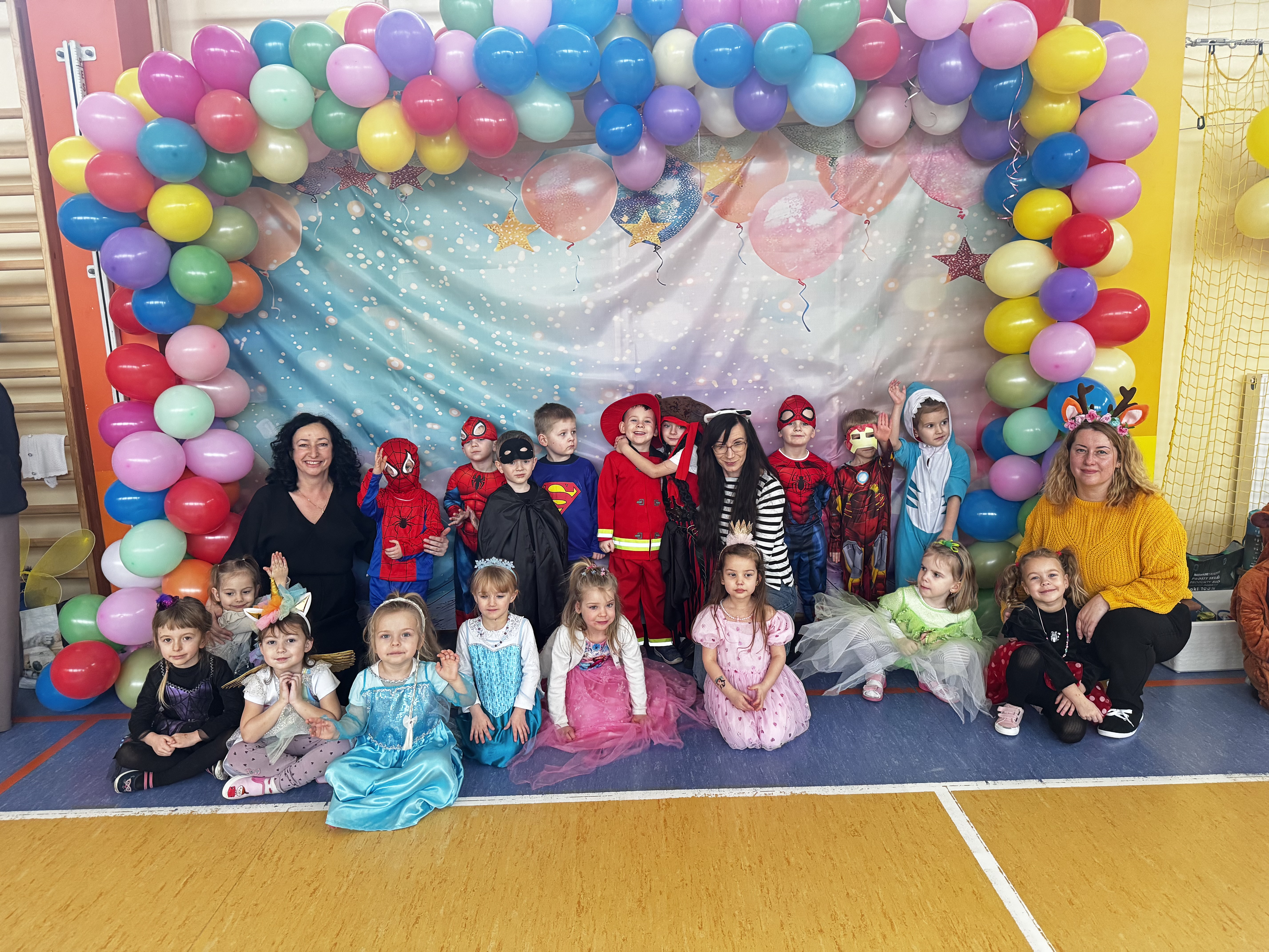 Sala gimnastyczna na ten wyjątkowy dzień zamieniła się w kolorową, bajkową przestrzeń. O piękny i pomysłowy wystrój zadbali rodzice, którzy z wielkim zaangażowaniem przygotowali dekoracje. Serdecznie dziękujemy rodzicom za poświęcony czas, kreatywność oraz ogromne wsparcie – dzięki nim atmosfera balu była naprawdę wyjątkowa. Tego dnia przedszkolaki pojawiły się w barwnych i pomysłowych przebraniach. Wśród uczestników można było spotkać księżniczki, superbohaterów, zwierzątka oraz wiele innych bajkowych postaci. Dzieci z dumą prezentowały swoje stroje i chętnie brały udział we wspólnej zabawie.