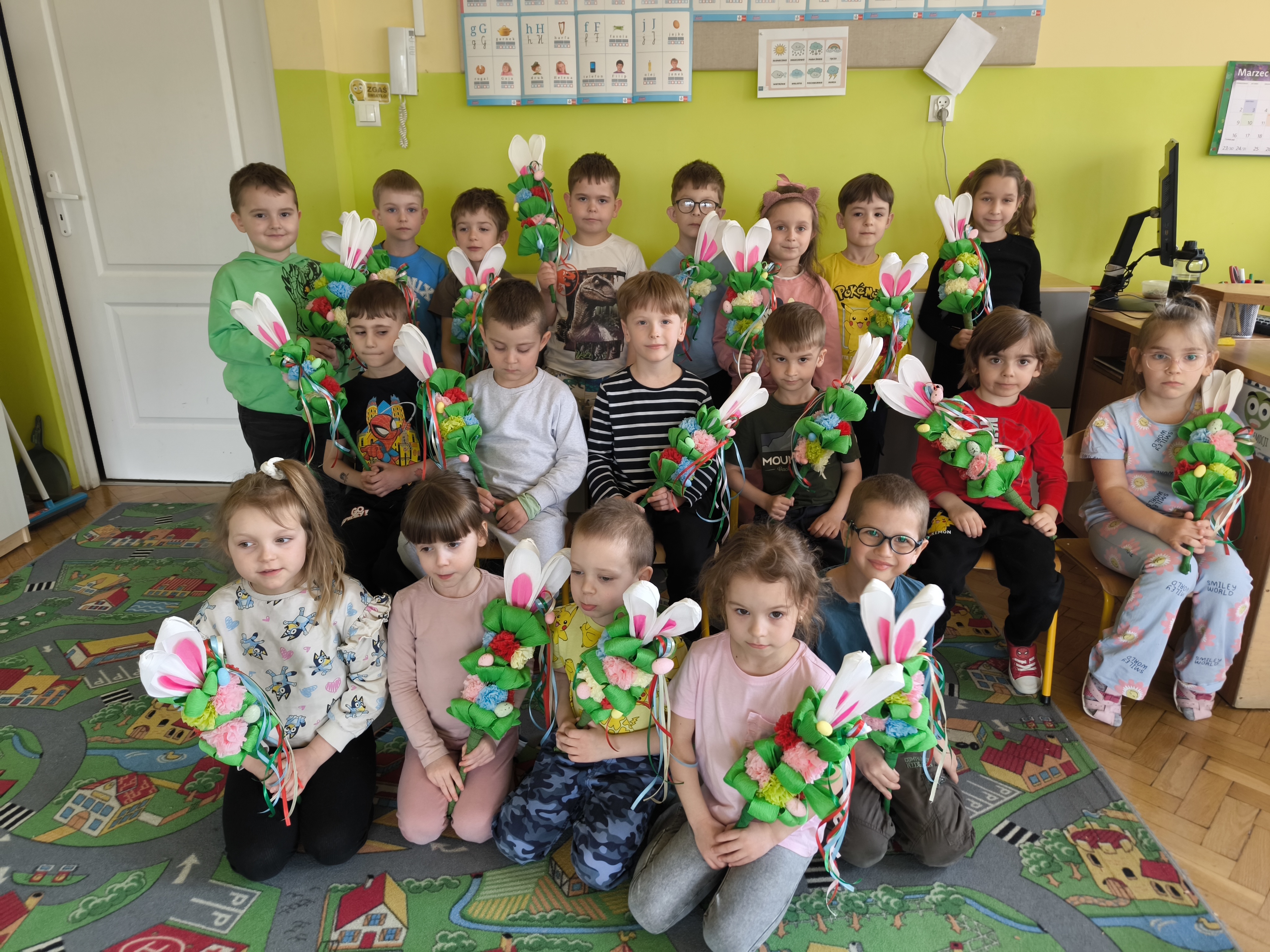 Z pomocą lub pod czujnym okiem swoich pań przedszkolaki wykonywały kolorowe palmy wielkanocne. Wykorzystując bibułę, wstążki oraz naturalne materiały, dzieci rozwijały swoją kreatywność i zdolności manualne, tworząc prawdziwe małe dzieła sztuki.